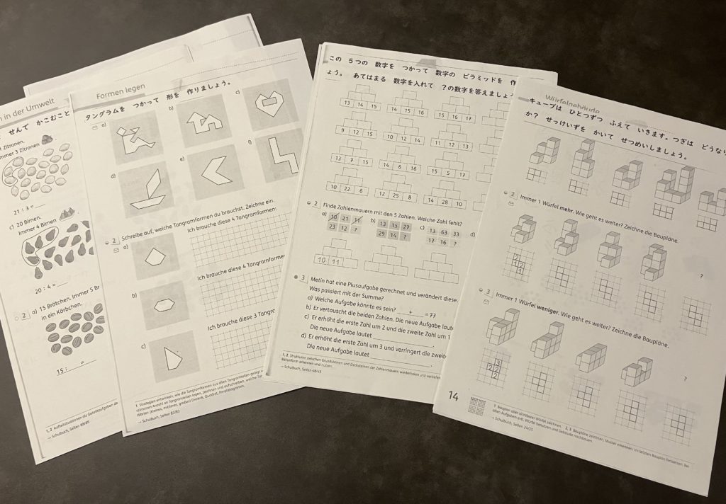 企画室内には、立体化された図形たち、そしてなんとドイツの算数ワークがずらり。