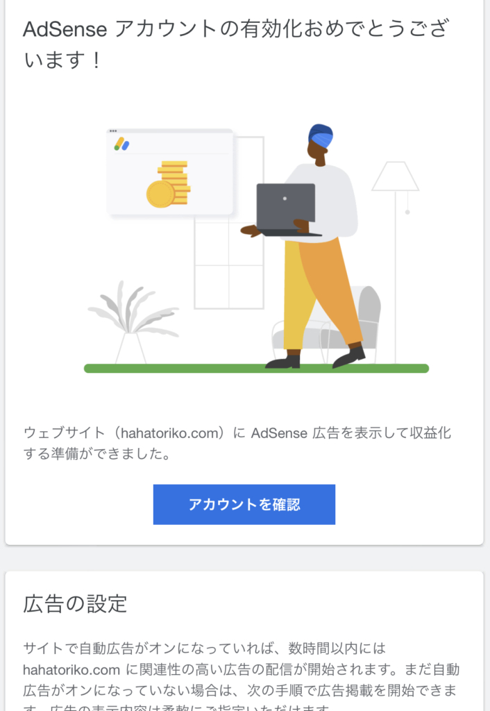 自動チェックかもしれないけれど、Googleの審査担当の方が見てくれた可能性もあったわけで、なんだか少し自信を持って記事を書ける気がして来ました。目指す目標が絵に描いた餅にならないように、お役に立てるサイトづくり頑張ります。