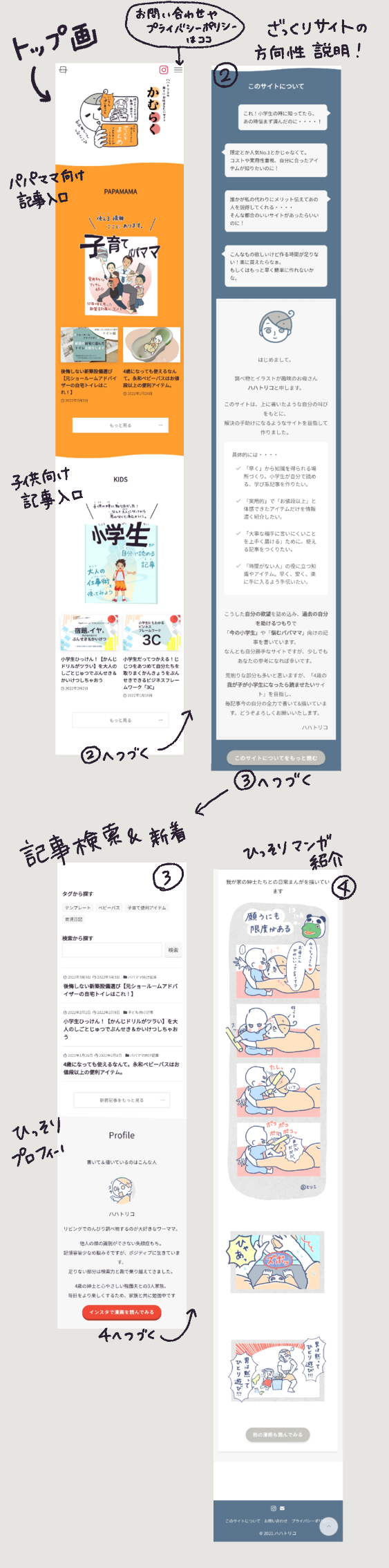 タブレットで開いた記事をそのまま子供に渡して見せられるレベルが理想。 - モヤモヤした悩みをもって検索した人が、ちょっと心を楽にできる情報を提供出来るサイトにしたい。押し付けないタイプのポジティブでありたい。芯となる部分はまじめだけど、ユーモア多めに。イラストやまんがを使った、楽しい感じのサイトにしたい。